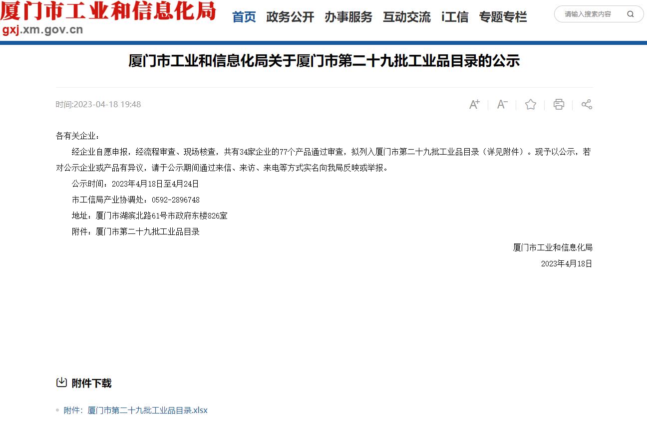 4月28日,廈門市工業(yè)和信息化局于公示期結(jié)束后正式發(fā)布廈門市第29批工業(yè)品目錄,廈門勢拓智動科技有限公司名列其中。